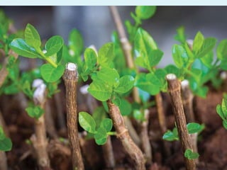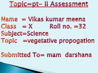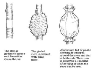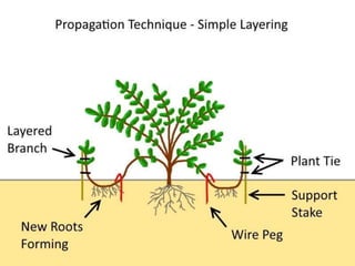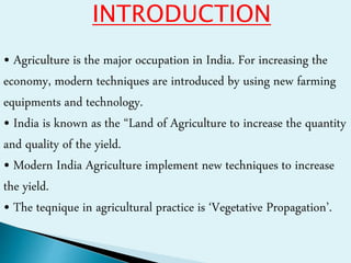 Vegetative propagation is a method of asexual plant reproduction that involves using plant parts like stems, leaves, and roots to produce new plants with identical genetics to the parent plant. It allows for mass production of plants and preservation of desirable traits without using seeds. Common vegetative propagation techniques include stem and root cuttings, layering, and grafting. Layering involves roots developing on a stem still attached to the parent plant, while grafting joins tissue from two plants together. Vegetative propagation is widely used in horticulture to reproduce desired varieties of crops.