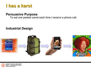 The document describes a conceptual design for a habit-building app called "I has a karot". The app aims to help users eat a carrot each time they receive a phone call by customizing their caller ID photo to remind them. It also provides storage for carrots in a backpack. According to initial user testing, the designer found they enjoyed snacking on carrots throughout the day but may forget during long calls or receive too many calls at once for the habit. The design could be expanded to other activities or automated further.