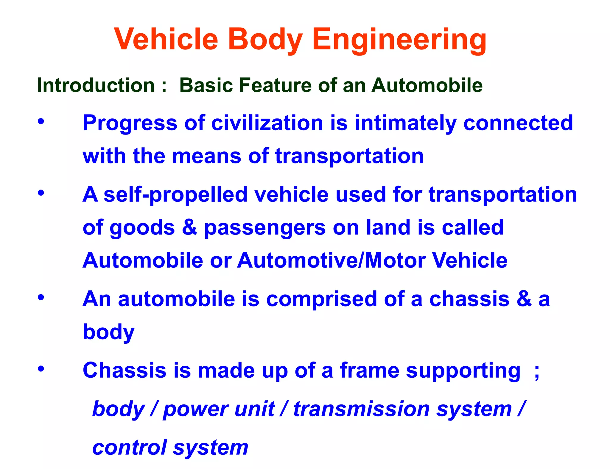1. It defines key terms related to vehicle body design such as chassis, body, suspension system, and power train.