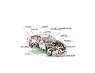 2. It describes the basic requirements for automobile body design including strength, stiffness, providing adequate space, minimizing air drag, and protecting occupants from weather, corrosion, and accidents.