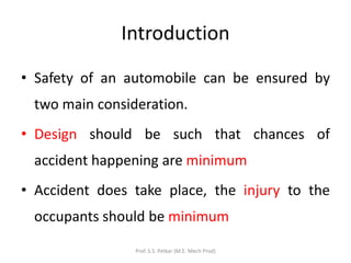 The document discusses various aspects of vehicle safety systems, highlighting the importance of preventive and passive safety features, such as the electronic stability program and head restraints designed to minimize accidents and injury during crashes. It details different types of safety glass used in automobiles, such as laminated and tempered glass, emphasizing their structural benefits and applications. Additionally, the text covers the role of mirrors, including blind-spot mirrors, in enhancing driver visibility and safety.
