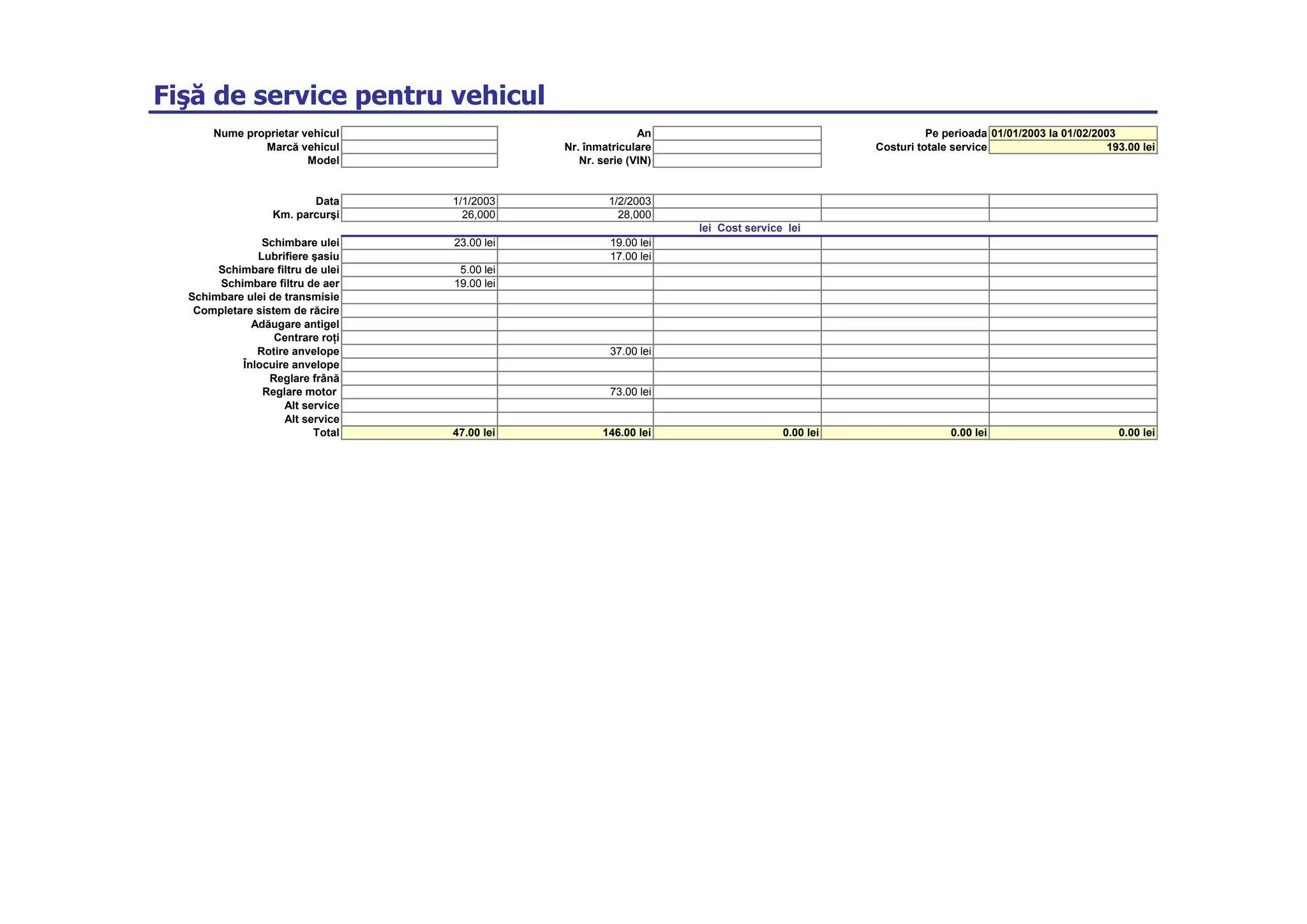 Documentul reprezintă o fișă de service pentru un vehicul, detaliind costurile totale ale reparațiilor între 1 ianuarie și 1 februarie 2003, în valoare de 193.00 lei. Activitățile efectuate includ schimbarea uleiului, lubrifierea șasiului și alte servicii de întreținere. Kilometrajul vehiculului a variat de la 26,000 km la 28,000 km în această perioadă.
