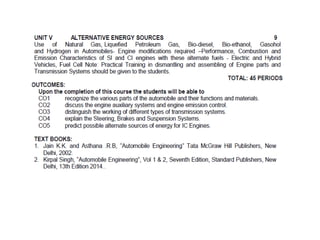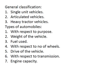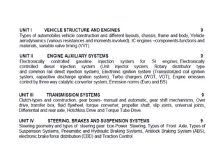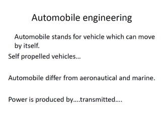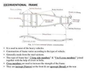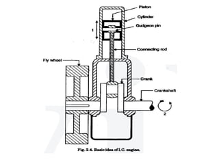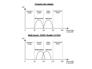 The document discusses vehicle structure and internal combustion engines. It describes the key components of an IC engine including the cylinder, piston, connecting rod, crankshaft, and flywheel. It also discusses the different parts of petrol and diesel engines. The document then covers vehicle construction and chassis components like the frame, suspension, steering, drivetrain, and wheels. It explains different types of frames and materials used. The working principles of 4-stroke petrol and diesel engines are covered along with the valve timing diagrams. Variable valve timing systems are also summarized.
