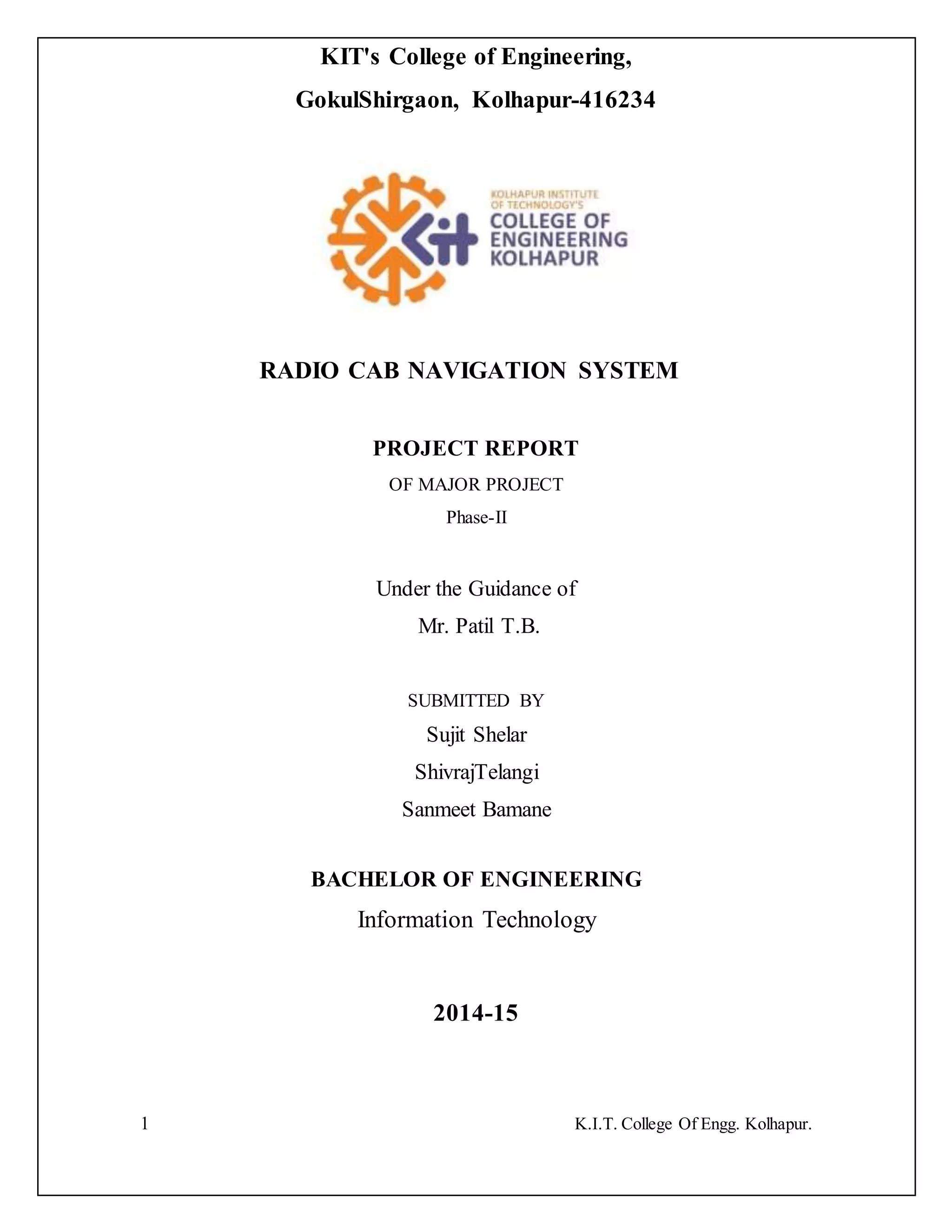 This document is a project report for a Radio Cab Navigation System created by students Sujit Shelar, Shivraj Telangi, and Sanmeet Bamane at KIT College of Engineering, Kolhapur under the guidance of Mr. Patil T.B. The report includes an introduction describing the system, literature review of existing and proposed systems, requirement specifications for the user interfaces and hardware/software requirements, and system design diagrams including entity relationship diagrams, data flow diagrams, class diagrams, sequence diagrams, use case diagrams, and state chart diagrams. The proposed system will use an Android application to allow customers to book taxis, track their locations, and allow drivers to accept orders.