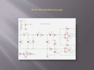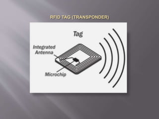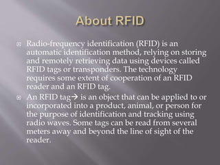 RFID is a technology that uses radio waves to automatically identify objects. RFID tags attached to objects are scanned by an RFID reader to transmit data wirelessly. A basic RFID system consists of an antenna that emits radio signals, a transceiver that controls data acquisition and communication, and a transponder tag that contains identifying information transmitted to the reader. The document discusses applications of RFID technology including tracking objects and automating processes like access control and parking systems.