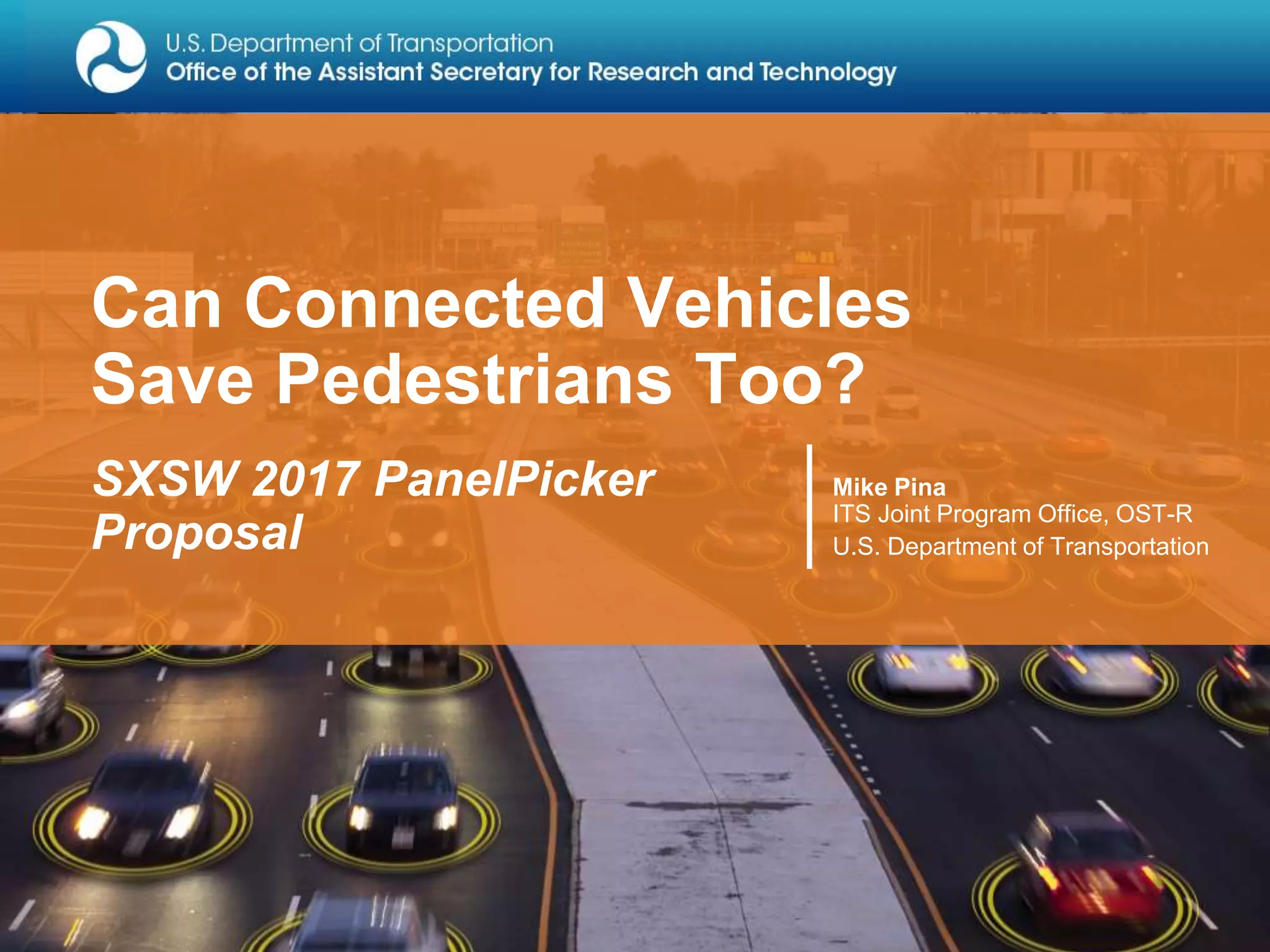The document discusses a proposal for a panel at SXSW 2017, presented by Mike Pina from the U.S. Department of Transportation, focusing on how connected vehicles can enhance pedestrian safety. It outlines various applications that can reduce traffic accidents and improve overall efficiency, such as warning systems for pedestrians and drivers about potential collisions. It also emphasizes the role of wireless technology in facilitating communication between vehicles and pedestrians to prevent accidents.