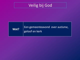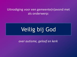 meer informatieIn ‘Veiligbij God’ wordt hun geloofsbeleving beschreven. En worden praktische handreikingen geboden voor het omgaan met autisme en geloof, zowel thuis, op school als in de kerk.