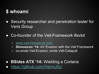 The document discusses Veil-PowerView, a PowerShell framework designed for situational awareness in exploited hosts and networks. It includes various functions that replace traditional 'net' commands, allowing users to gather detailed information about domain users, shares, and machines without dropping binaries to disk. The author highlights its utility for penetration testing, especially in environments where 'net' commands are restricted.