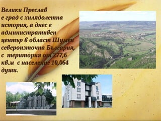 Велики Преслав е град с хилядолетна история, а днес е административен център в област Шумен североизточна България, с територия от 277,6 кв.м с население 10,064 души.