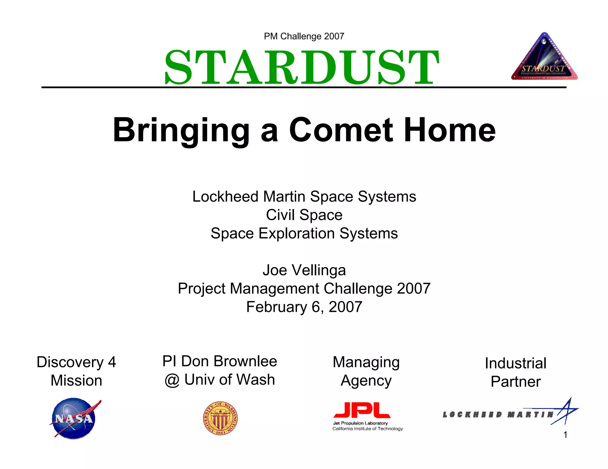 The Stardust mission collected samples from comet Wild 2 and interstellar dust particles. It launched in February 1999 and encountered Wild 2 in January 2004, collecting dust samples in aerogel. It returned the samples to Earth safely in January 2006. The spacecraft used an innovative Whipple shield to protect itself from comet dust impacts during the encounter. Analysis of the Stardust samples has provided insights about comet composition and the early solar system.