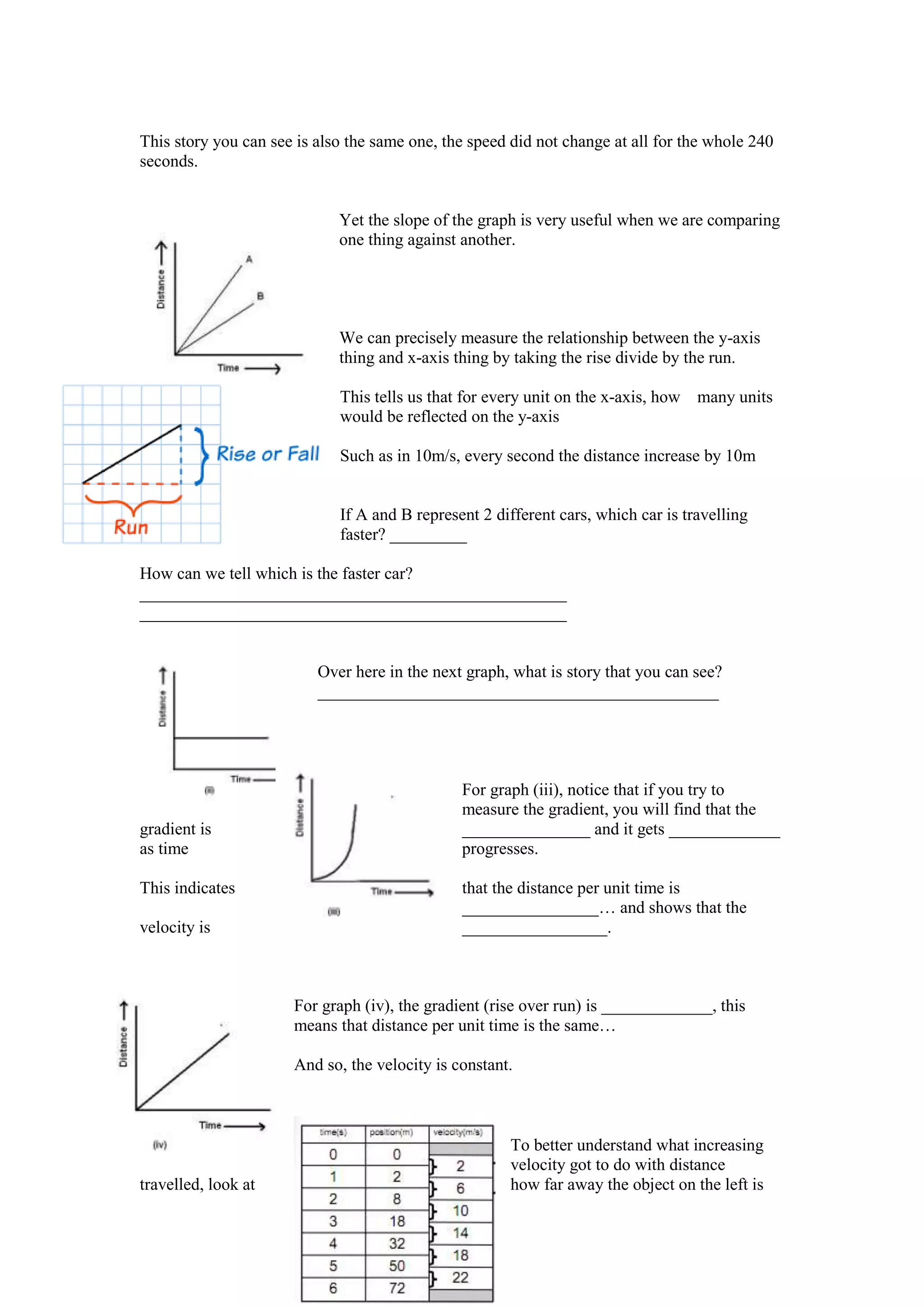 3) Graphs can show velocity, acceleration, distance, and other variables over time. Slope represents rate of change and can indicate if velocity or acceleration is constant or varying.