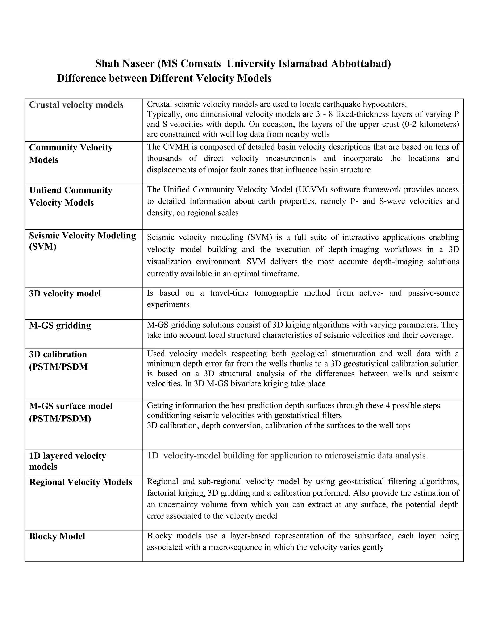 The document discusses several types of seismic velocity models including 1D layered models, community velocity models based on direct measurements, unified community models, and 3D tomography models derived from active and passive seismic data. It provides details on numerous global and regional reference models for the crust, mantle, and specific tectonic provinces.