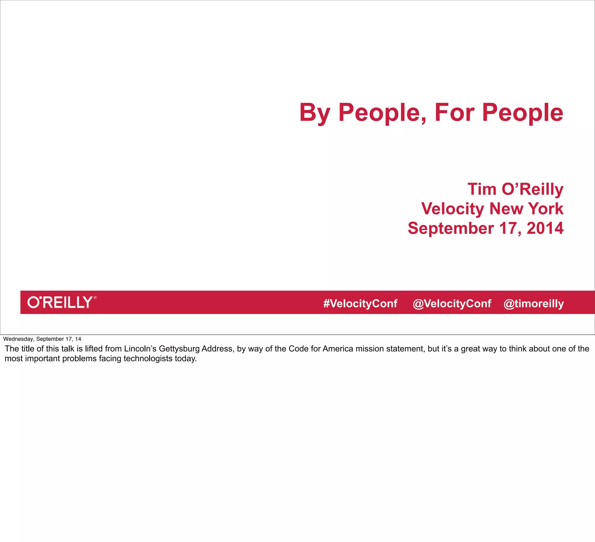 This document summarizes Tim O'Reilly's talk at the Velocity New York conference on September 17, 2014. The talk discusses how new technologies require new ways of organizing people, as seen in examples like factories, open source software, wikis, the web, Uber, Airbnb, and Apple Stores. It emphasizes that software applications involve people and are business processes, not just artifacts. The talk also discusses the DevOps movement and how it helped rescue the troubled Healthcare.gov website by focusing on communication and keeping promises between teams. Finally, it discusses how Code for America aims to help local governments solve problems through civic hacking.