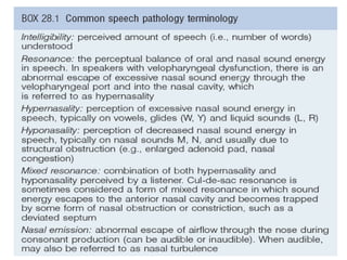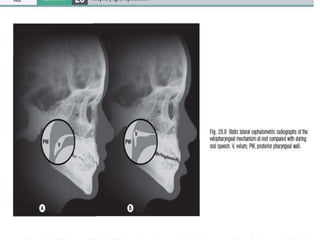I. Velopharyngeal dysfunction occurs when the velopharyngeal valve does not properly close during speech, causing hypernasality and other speech issues. It can be caused by structural abnormalities (insufficiency), neurological/muscular issues (incompetence), or improper learning of speech sounds (mislearning). Successful treatment requires a team approach including surgeons, speech therapists, and other specialists to precisely diagnose the cause and customize treatment.