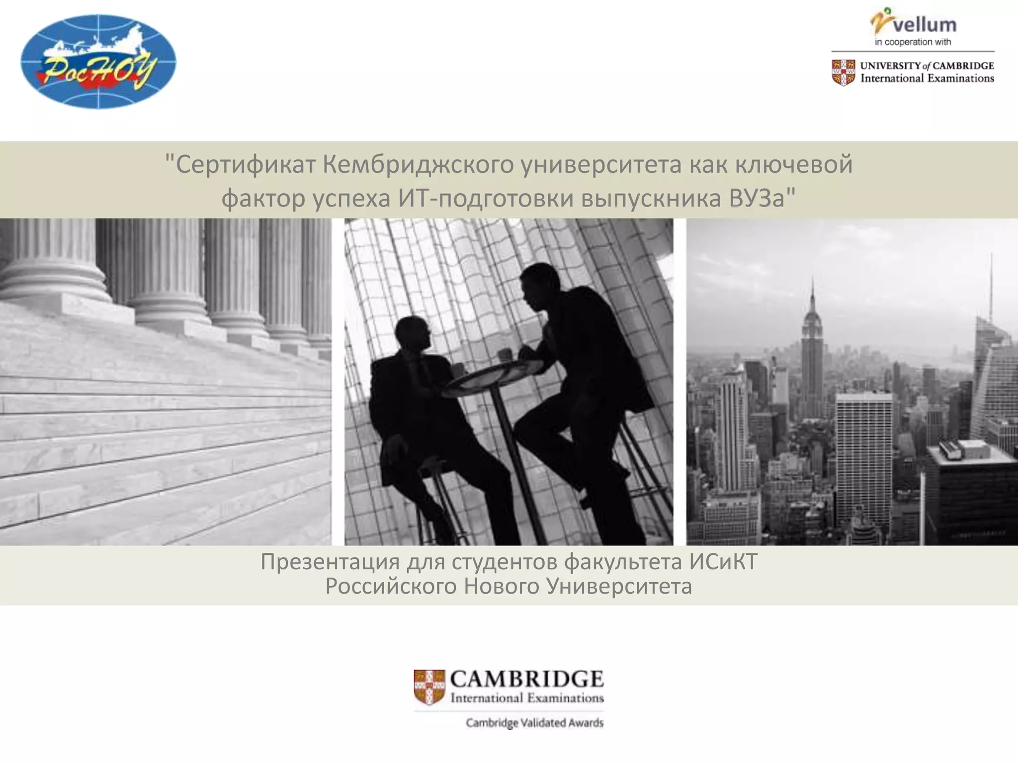 Документ представляет сертификат Cambridge International IT Diplomas как ключевой элемент для повышения IT-компетенций студентов и их трудоустроенности. Он подчеркивает важность компьютерной грамотности для карьерного роста и конкурентоспособности на рынке труда, а также описывает процесс сертификации и преимущества, связанные с получением международного диплома. Программа сертификации интегрирована в образовательные стандарты России и предоставляет студентам возможности для подтверждения своих навыков в признанной международной организации.