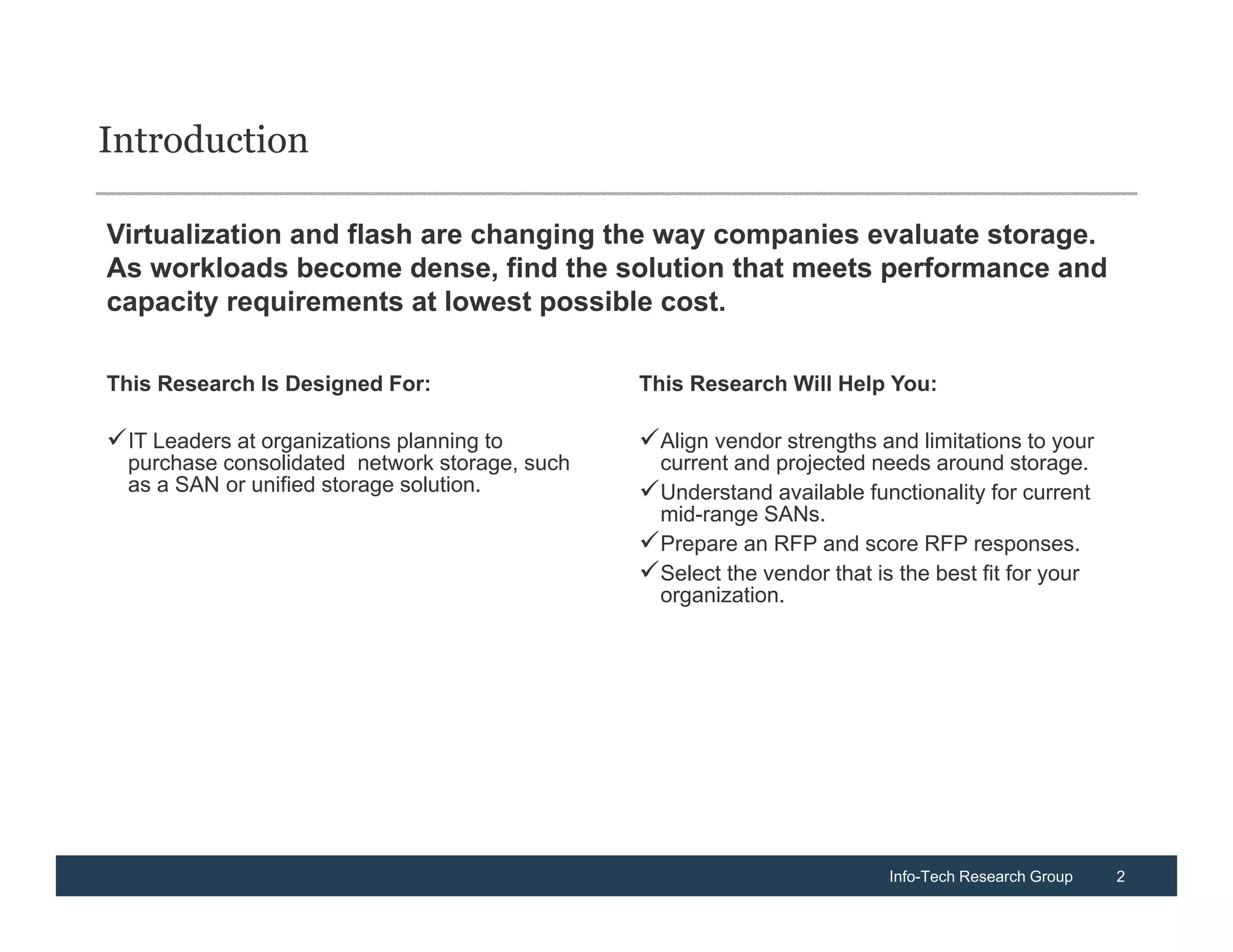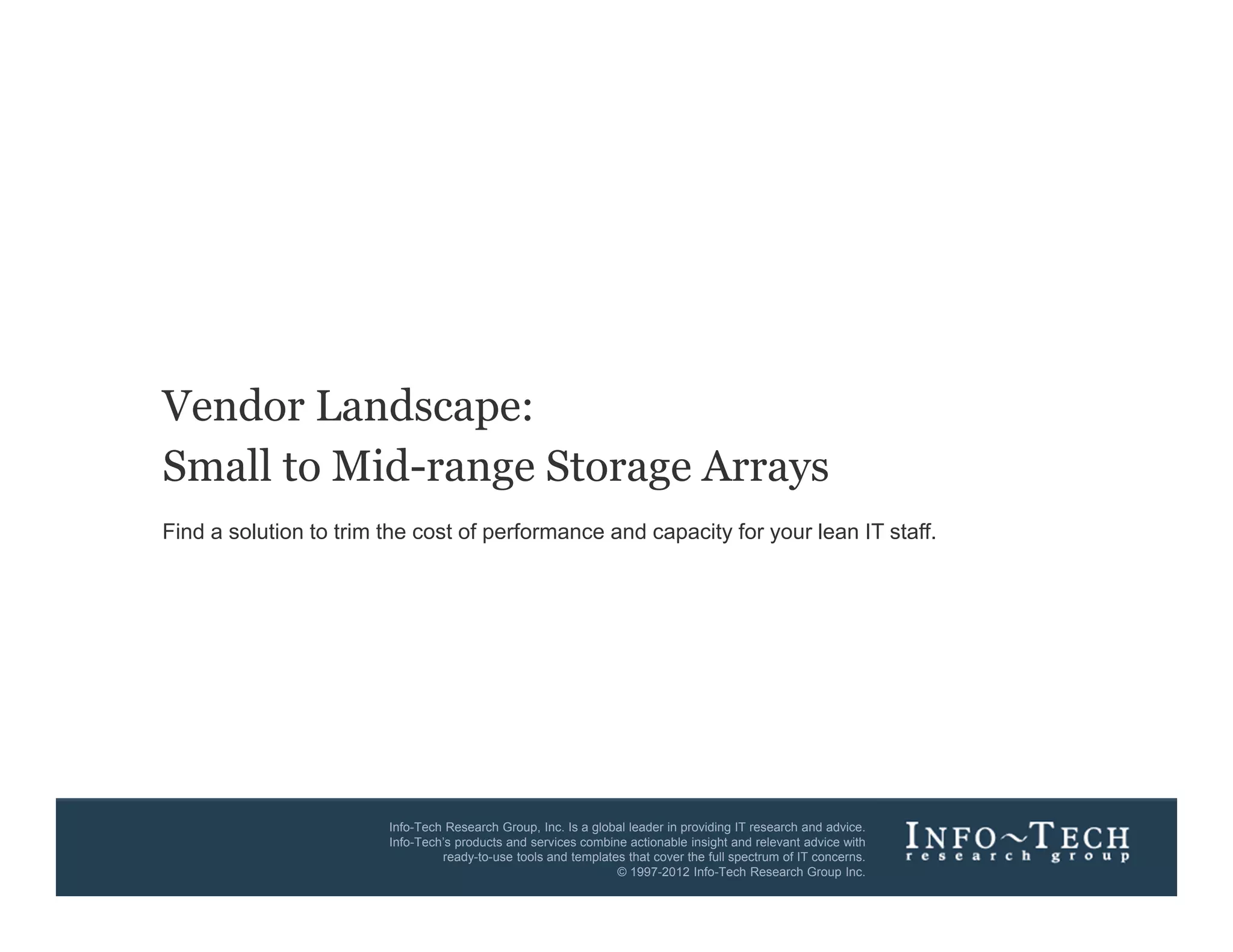 The document evaluates the small to mid-range storage vendor landscape, highlighting key players such as NetApp, Dell, and Nimble Storage based on their performance, cost-effectiveness, and user satisfaction. It also discusses essential criteria for selecting storage solutions, including vendor support, scalability, and advanced features like VMware integration. The insights aim to assist IT leaders in aligning vendor strengths with their organization's storage needs while considering future costs and support capabilities.