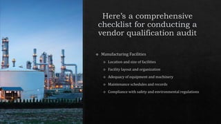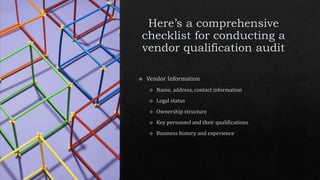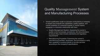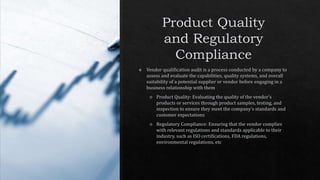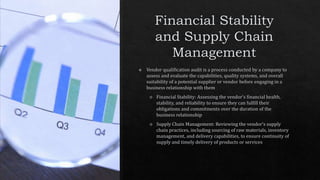 The document outlines key components of regulatory compliance, including adherence to industry standards and necessary certifications. It addresses financial stability through financial statements, creditworthiness, and insurance coverage, along with risk management strategies for identifying and mitigating potential risks. Additionally, it emphasizes ethical practices and the importance of documentation and record-keeping for compliance and audit purposes.