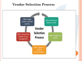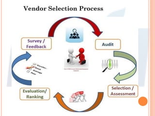 The document outlines a vendor selection process that includes auditing vendors using a checklist, analyzing the root causes of any non-conforming products, verifying corrective actions are implemented, and formally evaluating vendors.