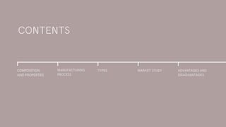The document discusses wood veneers, including their composition, manufacturing process, types, market study, advantages/disadvantages, and applications. Veneers are thin slices of wood or bark that are glued to core panels to produce flat surfaces. They go through a process of debarking, cooking, slicing, drying, quality checking, splicing and packing. Common types include ash, bamboo, birch, cherry and teak. A market study examines key companies, sizes, thicknesses, prices and finishes. Veneers provide aesthetic wood looks at low cost and increase durability, while disadvantages include water damage susceptibility and needing maintenance. Main applications are commercial, casework and covering MDF/particleboard.