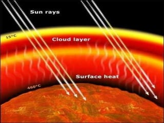Venere, noto come 'il pianeta di fuoco', è il secondo pianeta del sistema solare e presenta temperature estreme fino a 460°C a causa di un forte effetto serra. Con dimensioni simili alla Terra, ha diverse caratteristiche fisiche, tra cui un nucleo ferroso e una predominanza di pianure desertiche e vulcani sulla sua superficie. Le sue nubi, che si muovono a velocità elevate, sorgono a circa 42-59 km nel cielo, creando un ambiente inospitale.