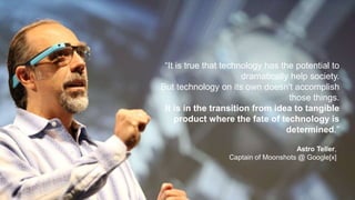 Il documento discute l'importanza della ricerca e dell'innovazione tecnologica, con particolare riferimento ai Google Glass come esempio di dispositivo wearable che può rivoluzionare le interazioni. Viene evidenziato un approccio di collaborazione sociale dove i prototipi vengono testati e migliorati dal mercato stesso, portando a risultati in vari settori tra cui salute, logistica e turismo. Infine, viene presentata l'app 'ok venice!' che offre un'esperienza interattiva di visita guidata a Venezia utilizzando i Google Glass.