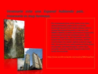 Venezuela is a Spanish-speaking country located in South America. It has diverse geography that includes snow-capped Andes mountains, Amazonian jungles, plains, beaches, and the world's highest waterfall. Venezuela's economy was historically based on agriculture but shifted to oil after its discovery in the 1920s. While known internationally for its oil wealth and political figures like Hugo Chavez, Venezuela has a rich cultural heritage and natural beauty that is undervisited by international travelers.