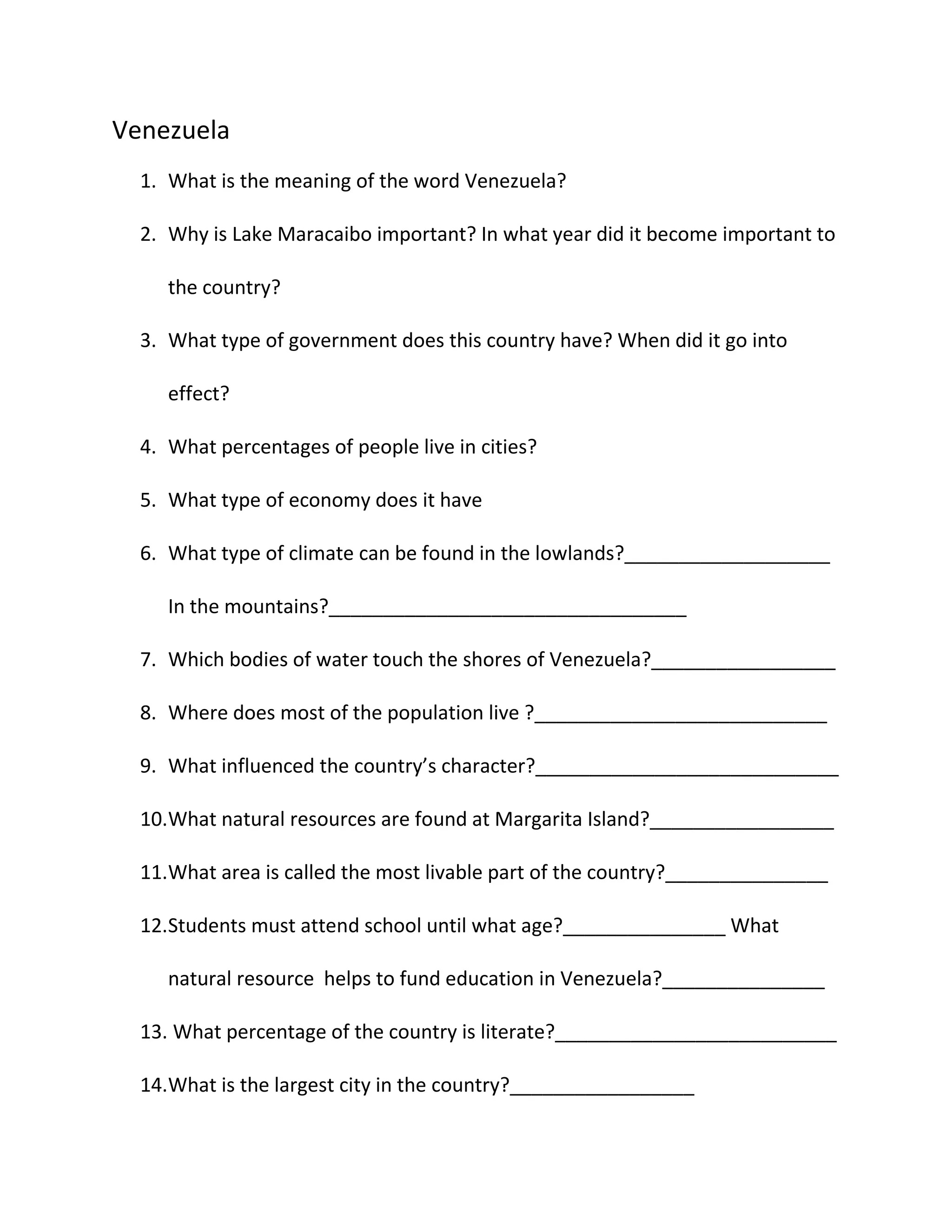 This document provides information about Venezuela in the form of questions. It asks about the meaning of the country's name, the importance of Lake Maracaibo and the year it became important. It also asks about the type of government, the percentage living in cities, the type of economy, climates in different areas, bodies of water bordering the country, population distribution, natural influences, natural resources on Margarita Island, the most livable part of the country, mandatory school attendance age, literacy rates, largest city, who liberated Venezuela and South America, the ethnic groups and their percentages, the major religion, and where most population centers are located.