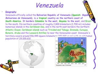 Venezuela is a tropical country located in northern South America with a population of over 29 million people. It has a diverse landscape and climate ranging from hot lowland plains to mountainous regions and glaciers. The population is made up of people with mixed European, African and indigenous ancestry and Spanish is the dominant language. Venezuela gained independence from Spain in the early 19th century after a protracted war of independence led by Simón Bolívar.