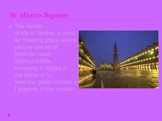 St. Mark's Square is the center of life in Venice, where people can stroll, listen to music, drink coffee, shop, and feed pigeons. Nearby is the El Campanario bell tower, originally built in the 9th century and reconstructed in 1902. The Basilica of San Marco is a masterpiece of Byzantine architecture built in 830 AD as a chapel for government leaders, containing magnificent mosaics. Next to the basilica is the Ducal Palace, the former residence and seat of government for the Doges, connected to an old prison by the Bridge of Sighs. The Rialto Bridge spans the Grand Canal and has shops along its sides. Other landmarks include the