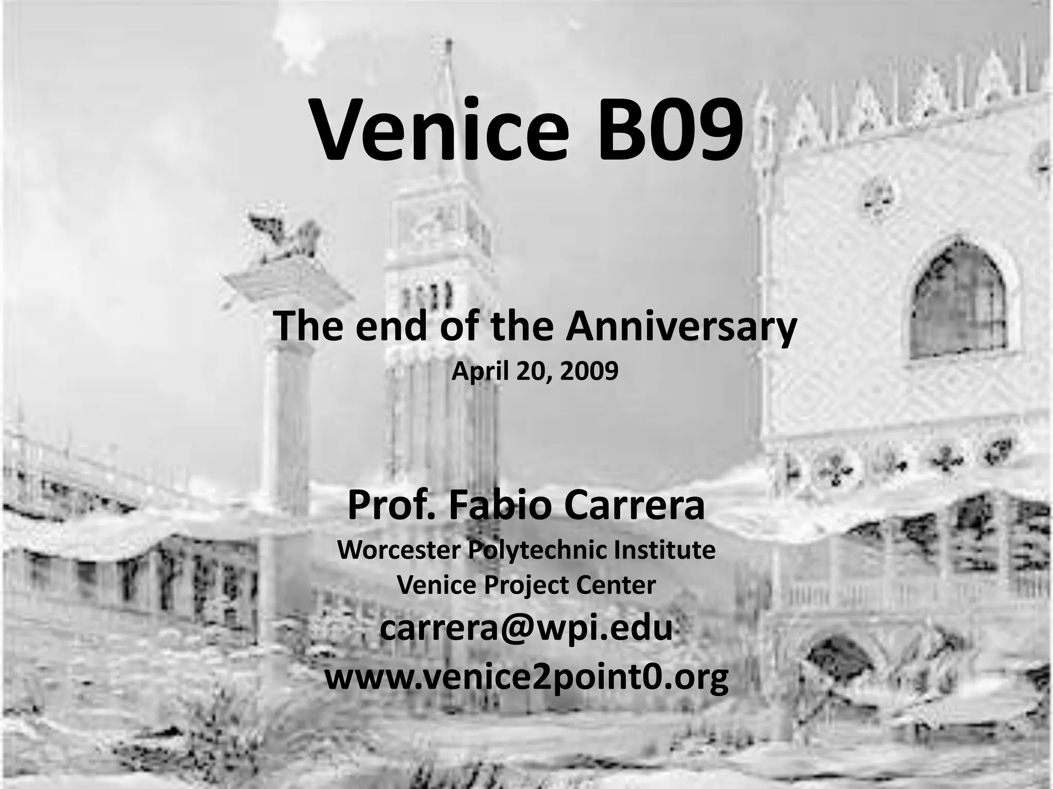 This document outlines the preparation and requirements for a study abroad program in Venice, Italy. Students are expected to complete Italian language study over the summer and in class during Term A to earn 30 points total for Italian. They must also contribute to online wikis about Venice's culture, history and art to earn 30 points. Finally, students will complete group projects while in Venice, contributing a minimum of 4 wiki entries each to earn 40 points. The document discusses the Italian language assessments, cultural preparation resources and trip logistics. Grades will be given at the end of Term A and can be replaced after completing work during the Venice trip in Term B.