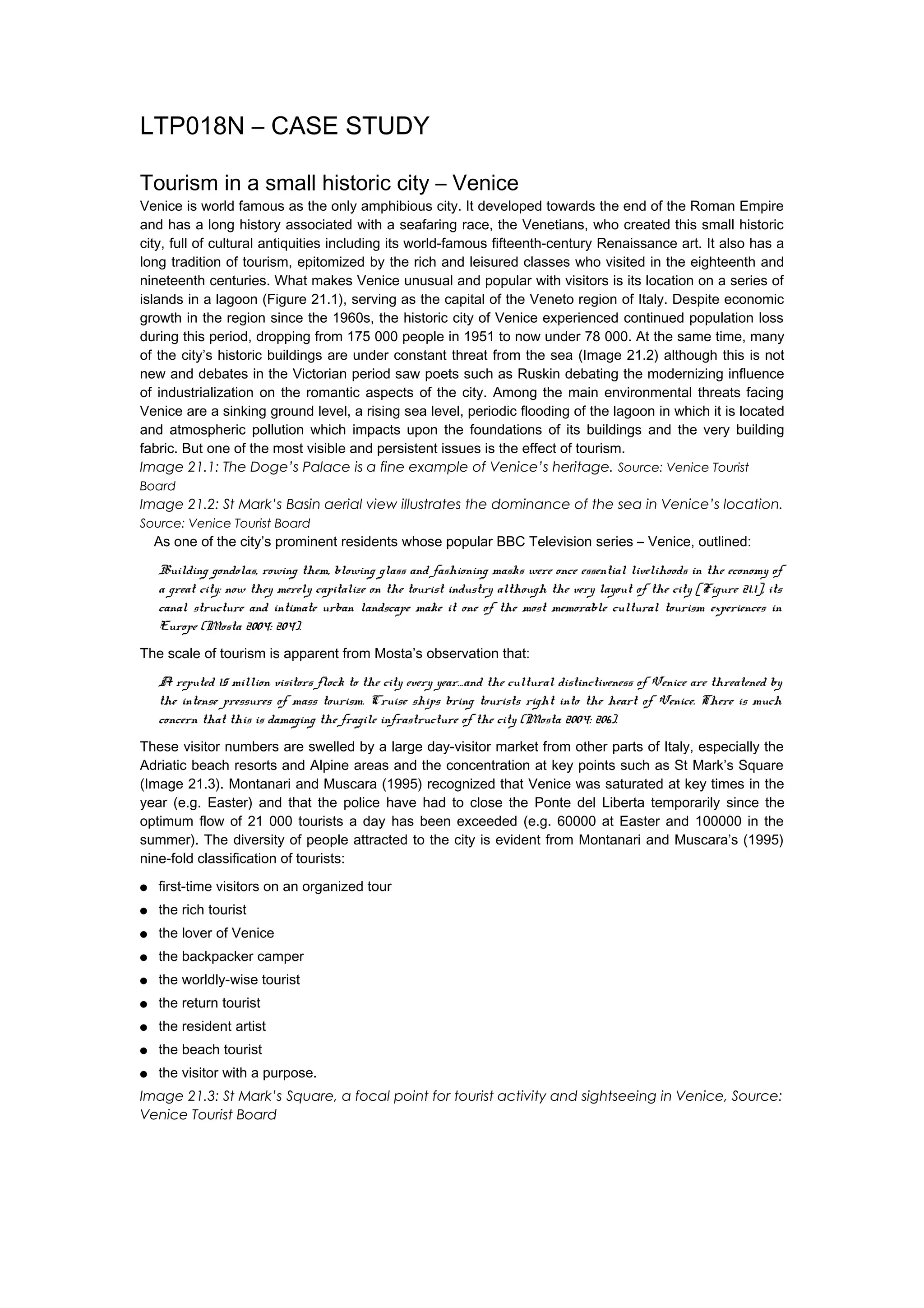 Venice is a historic city located on islands in a lagoon off the coast of Italy that experiences significant environmental threats and mass tourism. The historic city has seen its population drop from 175,000 to 78,000 while receiving around 15 million visitors annually. Tourism brings both economic benefits but also places strain on Venice's fragile infrastructure as the number of visitors often exceeds the carrying capacity of the city. Managing visitor numbers and directing tourists away from the most crowded areas will be important to preserve Venice's cultural heritage and living city status for the future.
