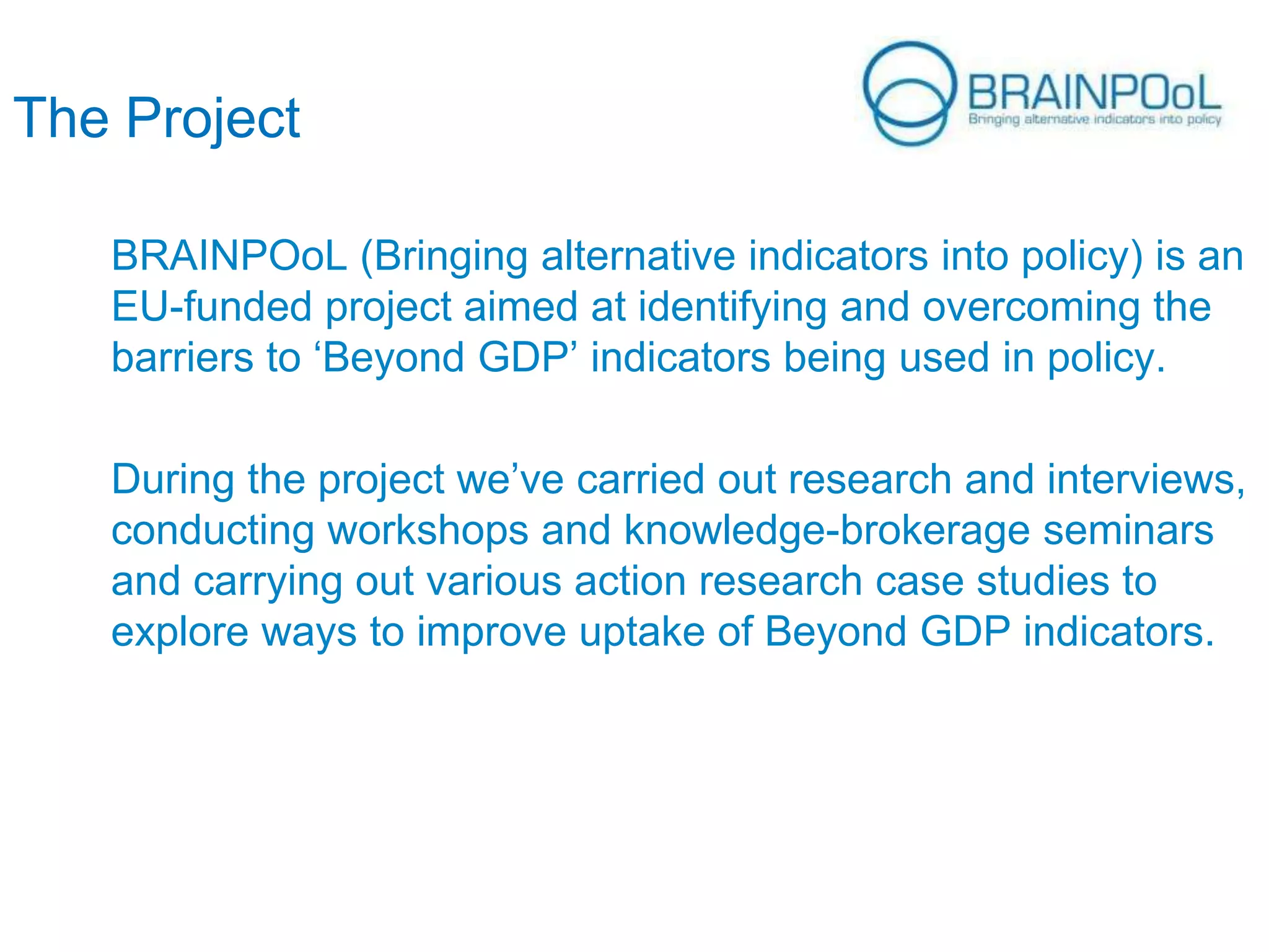 The document discusses the EU-funded project Brainpool, which aims to integrate 'beyond GDP' indicators into policy-making to address societal progress beyond traditional metrics like GDP. It highlights the challenges and biases in policy that prioritize GDP growth, and advocates for an integrated policy framework aiming to enhance overall well-being. Various initiatives are explored that employ these alternative indicators to influence policy changes at local and regional levels, demonstrating the practical impact of moving beyond GDP metrics.