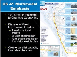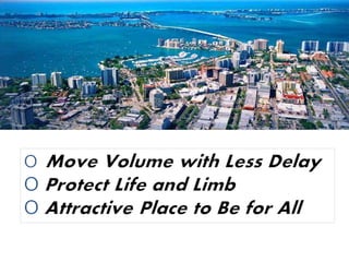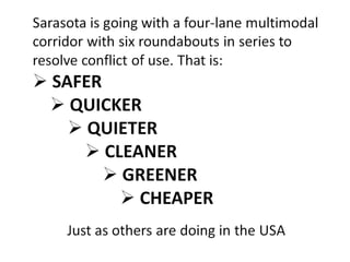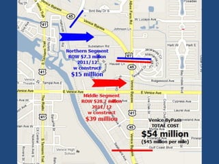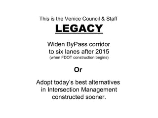 The document discusses the challenges and considerations surrounding the widening of the Venice bypass to six lanes, including cost implications and the potential impact on local businesses and traffic safety. It advocates for modern intersection management alternatives such as advanced traffic management systems and roundabouts, which have proven benefits in enhancing safety, efficiency, and local economic growth. The author urges decision-makers to prioritize safe and livable streets while addressing congestion and accessibility in the area.