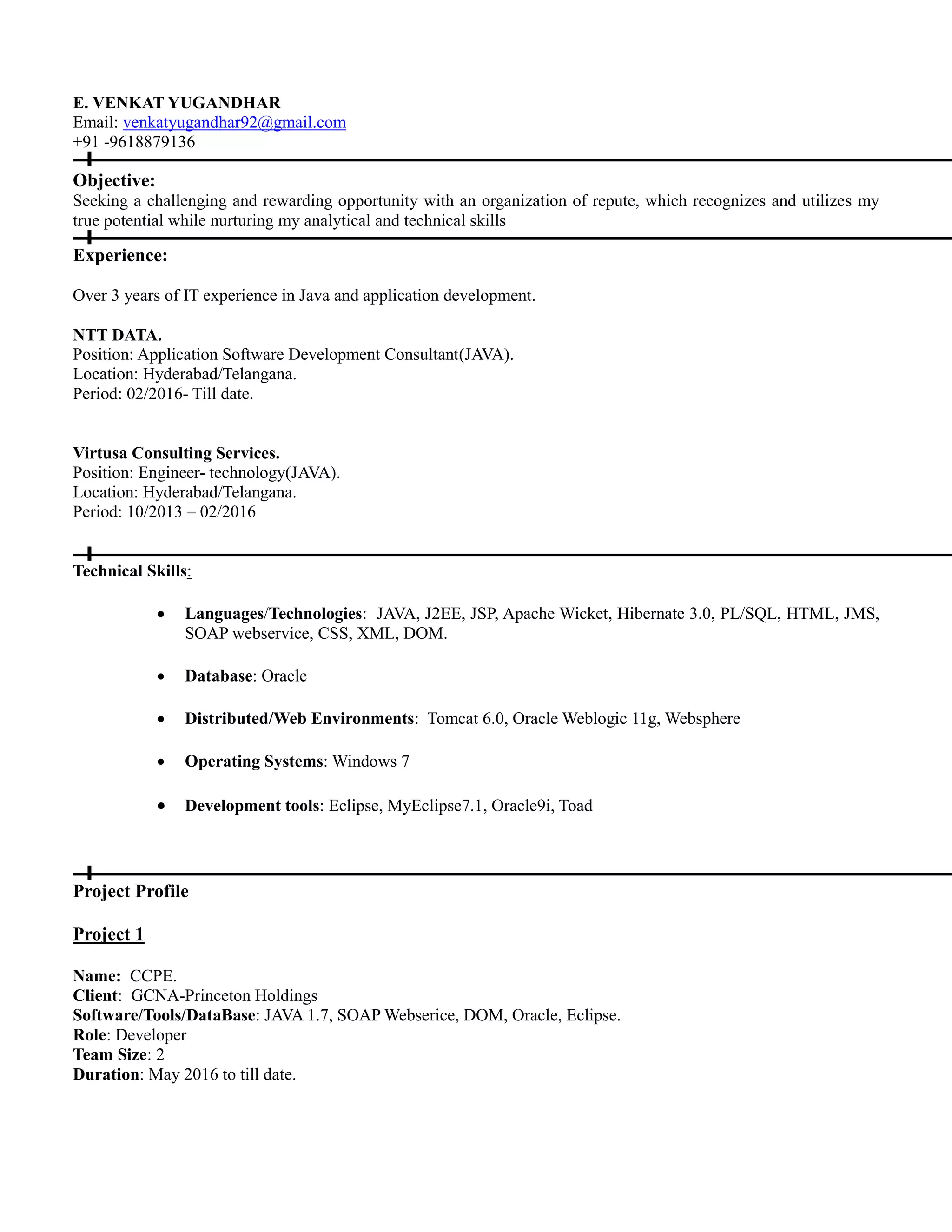 This document contains the resume of E. Venkath Yugandhar summarizing his objective, experience, skills, education, and personal details. He has over 3 years of experience in Java application development working for NTT Data and Virtusa Consulting Services. His technical skills include Java, J2EE, HTML, XML, Oracle, and development tools like Eclipse. He has worked on projects involving web services, databases, and web applications. He is seeking an opportunity to utilize his analytical and technical skills.