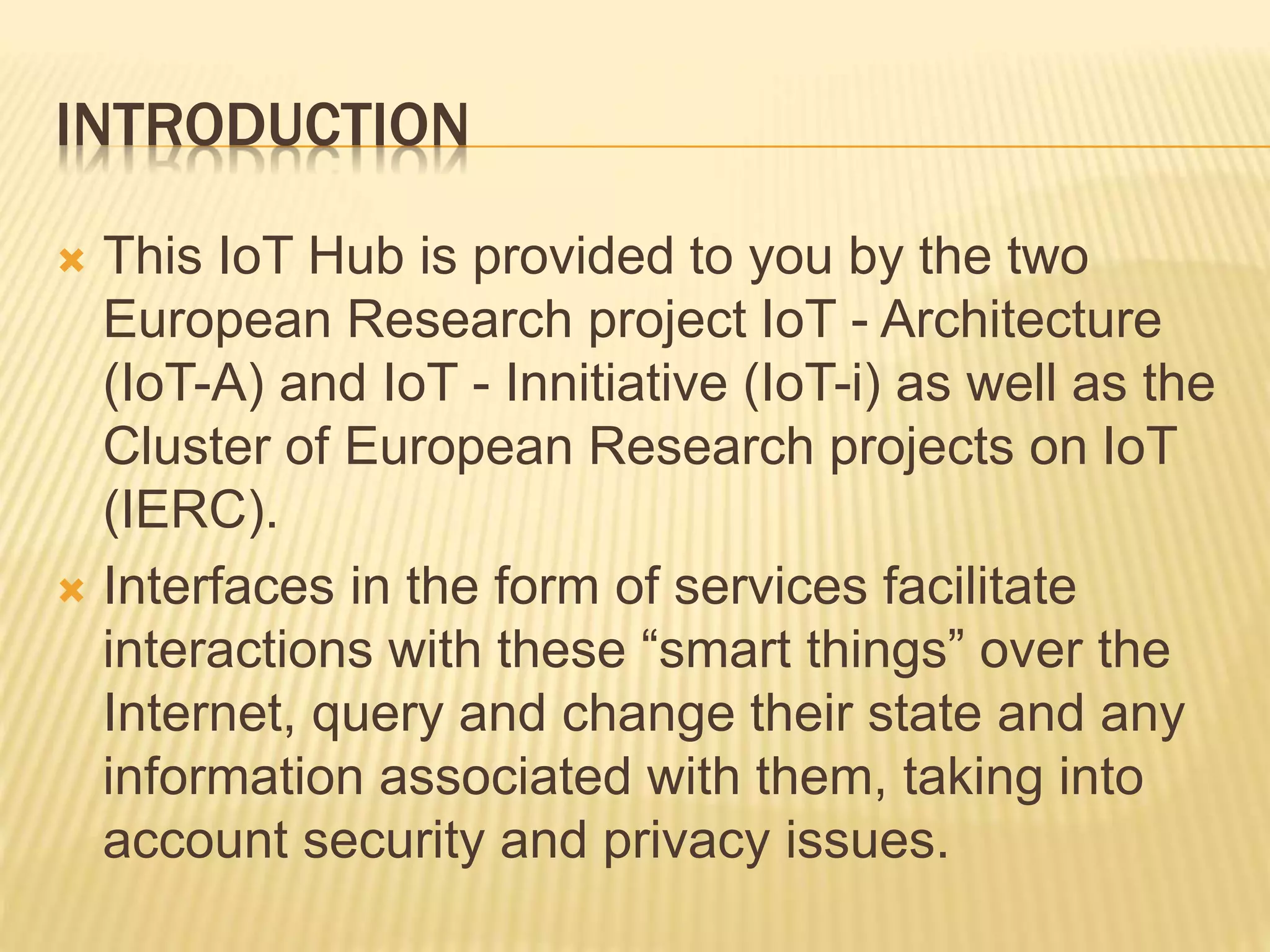 This document discusses trends and areas of interest in Internet of Things (IoT). It notes that IoT builds on interest in big data and suggests the full potential of data. It predicts that enterprises will increasingly implement IoT solutions and that security will be a critical area of focus, especially with the widespread sharing of data between connected devices. Understanding privacy and security implications will be important as IoT continues to grow and interconnect more devices.