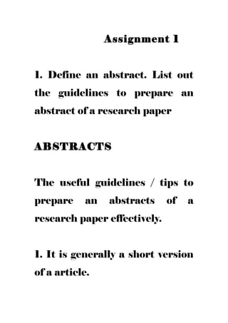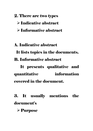 This document provides guidelines for preparing abstracts, outlines, and scientific papers. It discusses that an abstract is a short summary of a research paper that includes the purpose, scope, methodology, results, and conclusions. There are two types of abstracts: indicative and informative. An outline helps organize a paper into chapters, subheadings, and major discussion points. A scientific paper must be structured and include specific elements, such as the background, methodology, results, and conclusions, to clearly communicate the research.