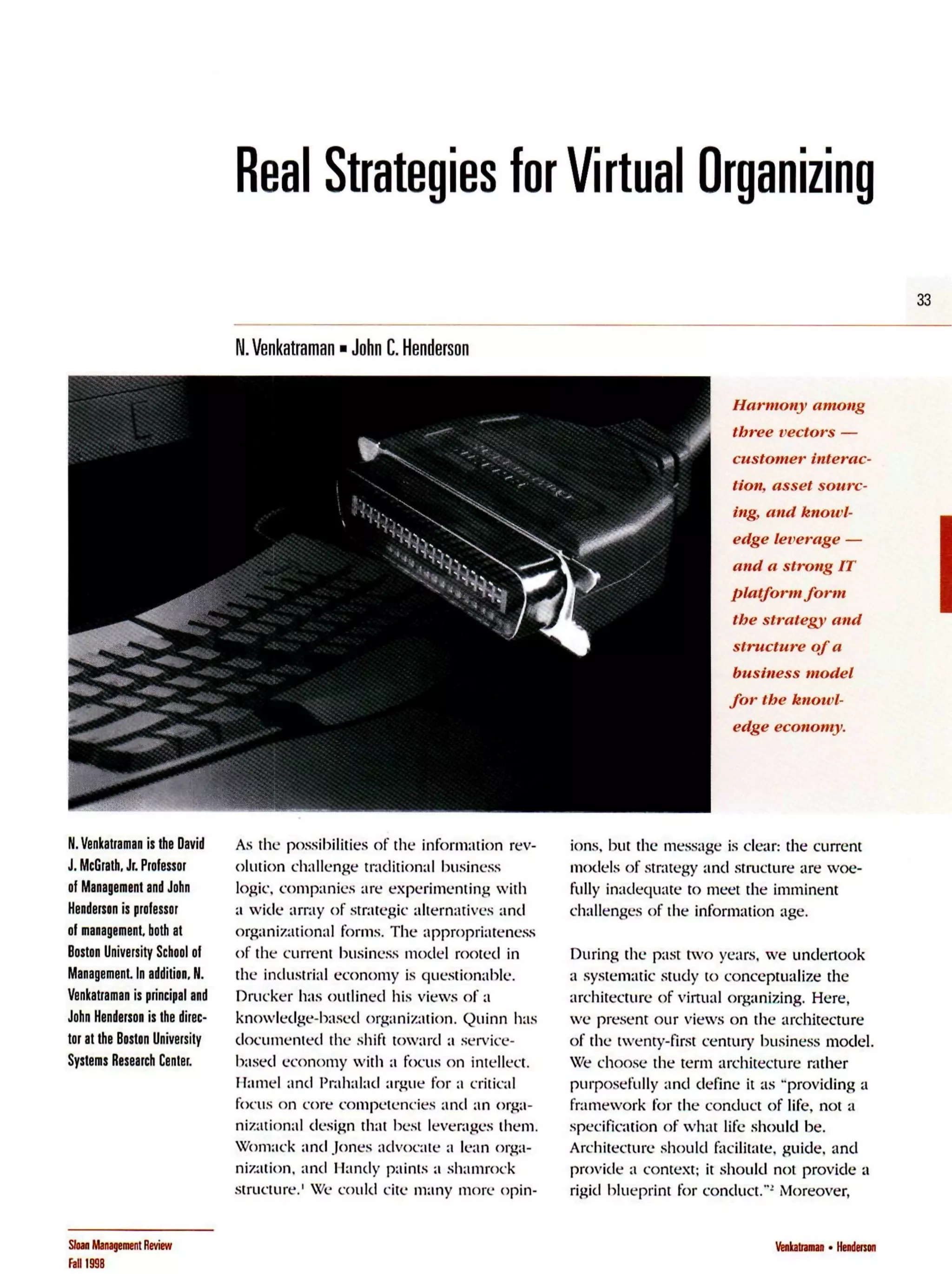 This document discusses a framework for virtual organizing in the digital age. It proposes that virtual organizing consists of three interdependent vectors: customer interaction, asset sourcing, and knowledge leverage. Each vector progresses through three stages - from a focus on task units, to the organizational level, to inter-organizational networks. An integrated IT platform is key to enabling the connections between these vectors and stages. The framework is presented as a new business model for companies to leverage virtual capabilities, rather than as a distinct organizational structure. Customer interaction involves remote experiences of products/services, dynamic customization, and customer communities.