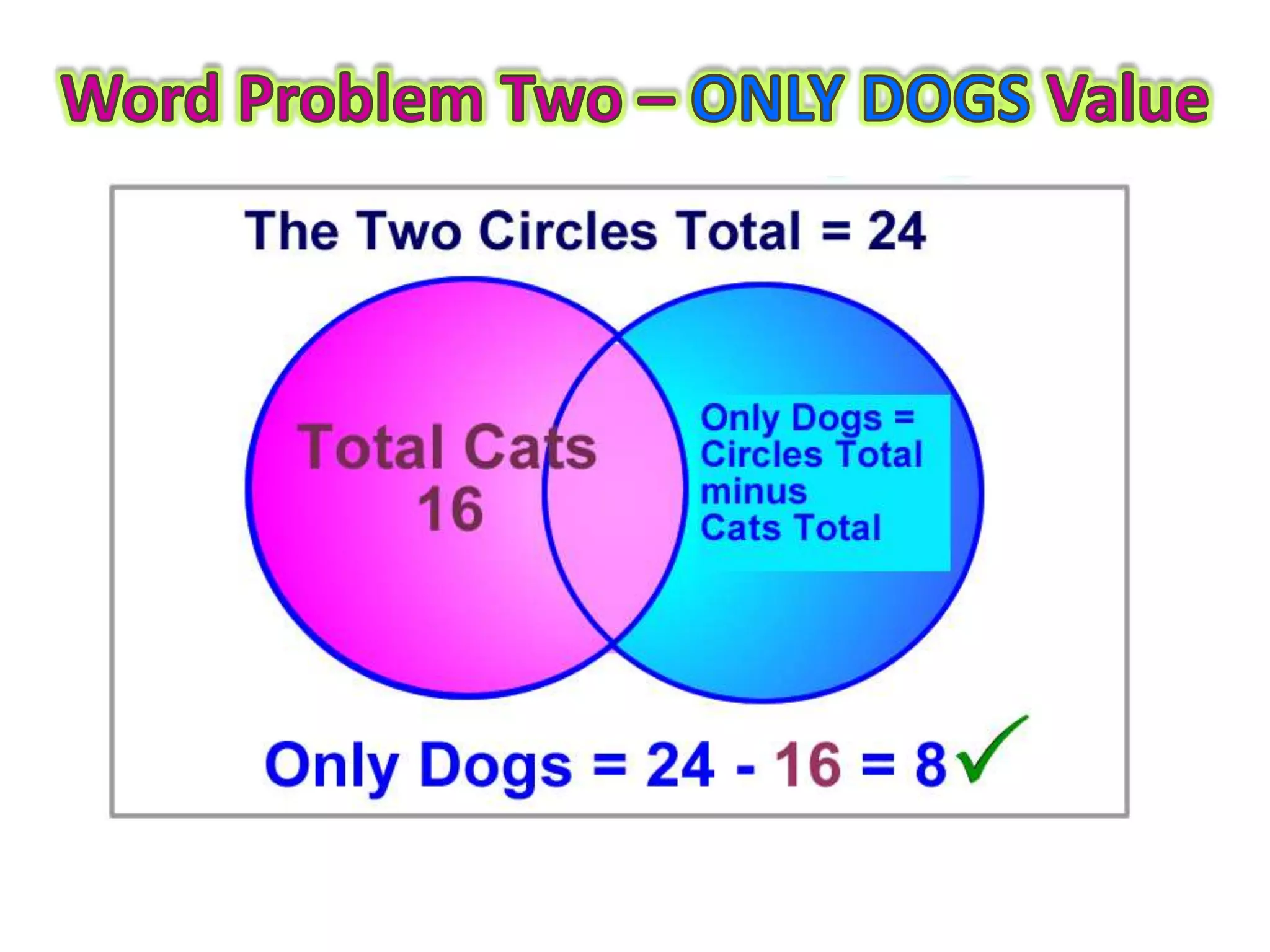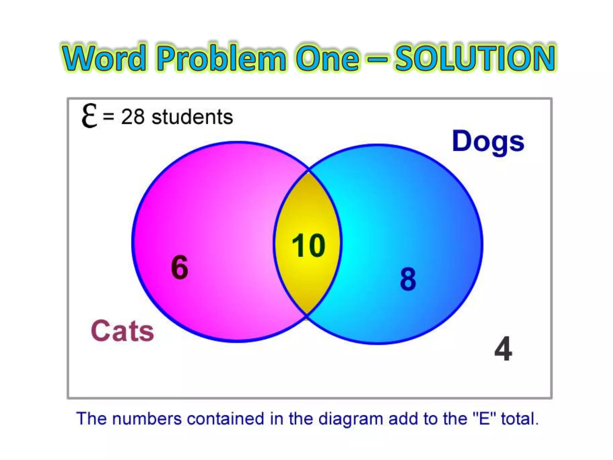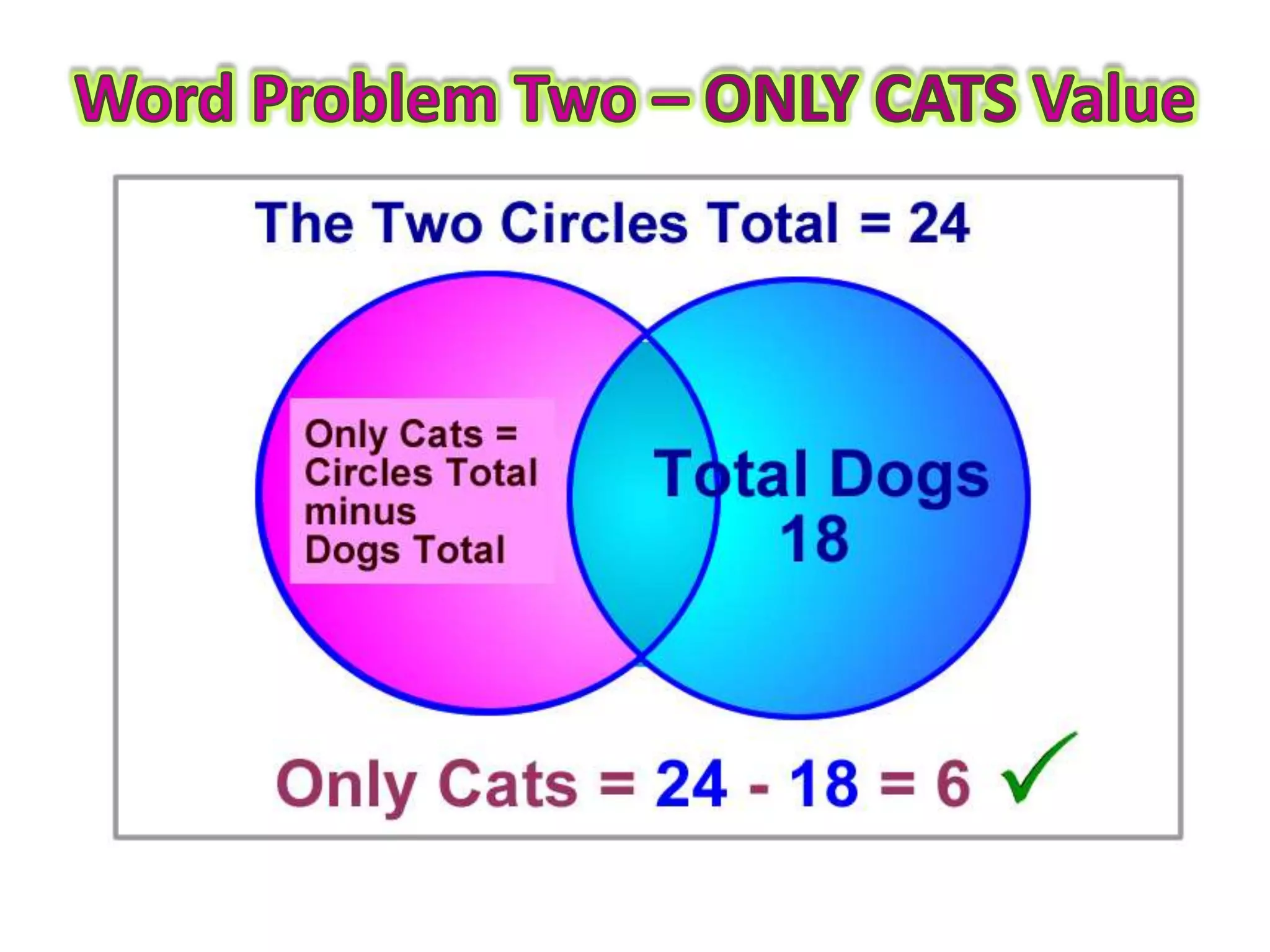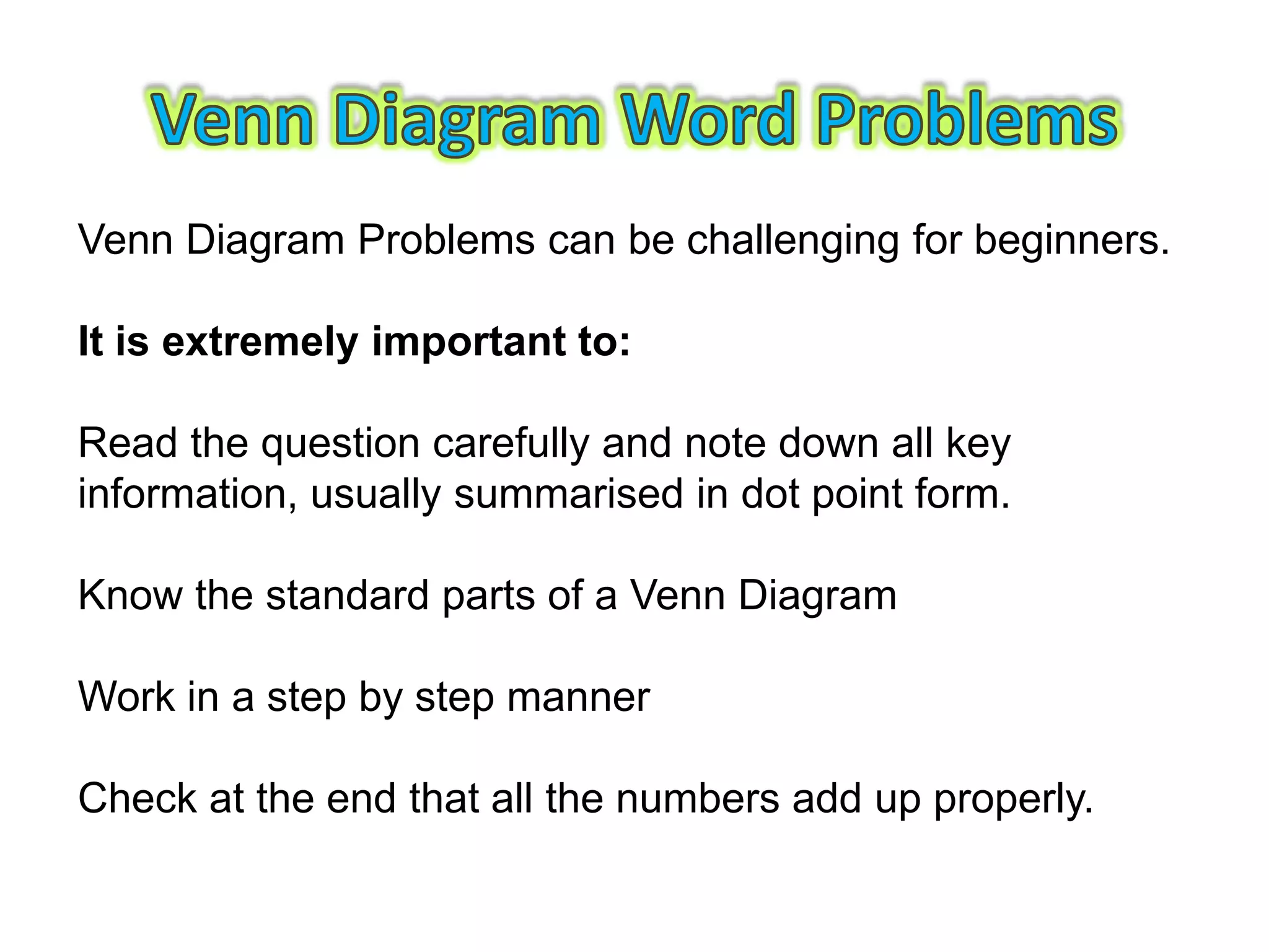 This document provides guidance on how to solve problems using Venn diagrams. It explains that Venn diagram problems require carefully reading the question, understanding the standard parts of a Venn diagram, and working step-by-step. It then walks through examples of 2-circle Venn diagram problems, demonstrating how to place the given information on the diagram and determine any missing values. The document emphasizes checking that all numbers add up correctly and discusses different types of relationships between sets, like intersecting, mutually exclusive, and subsets.