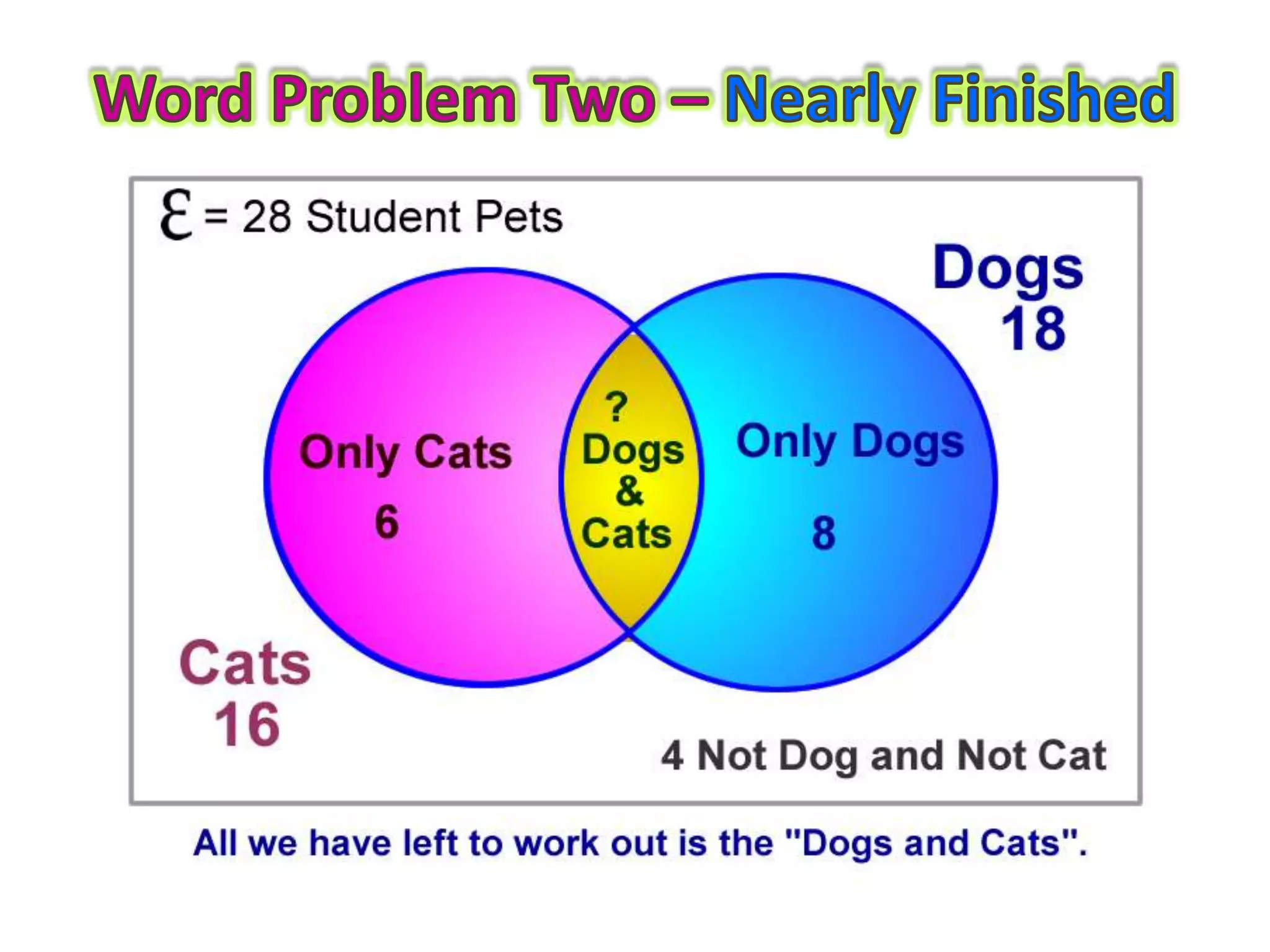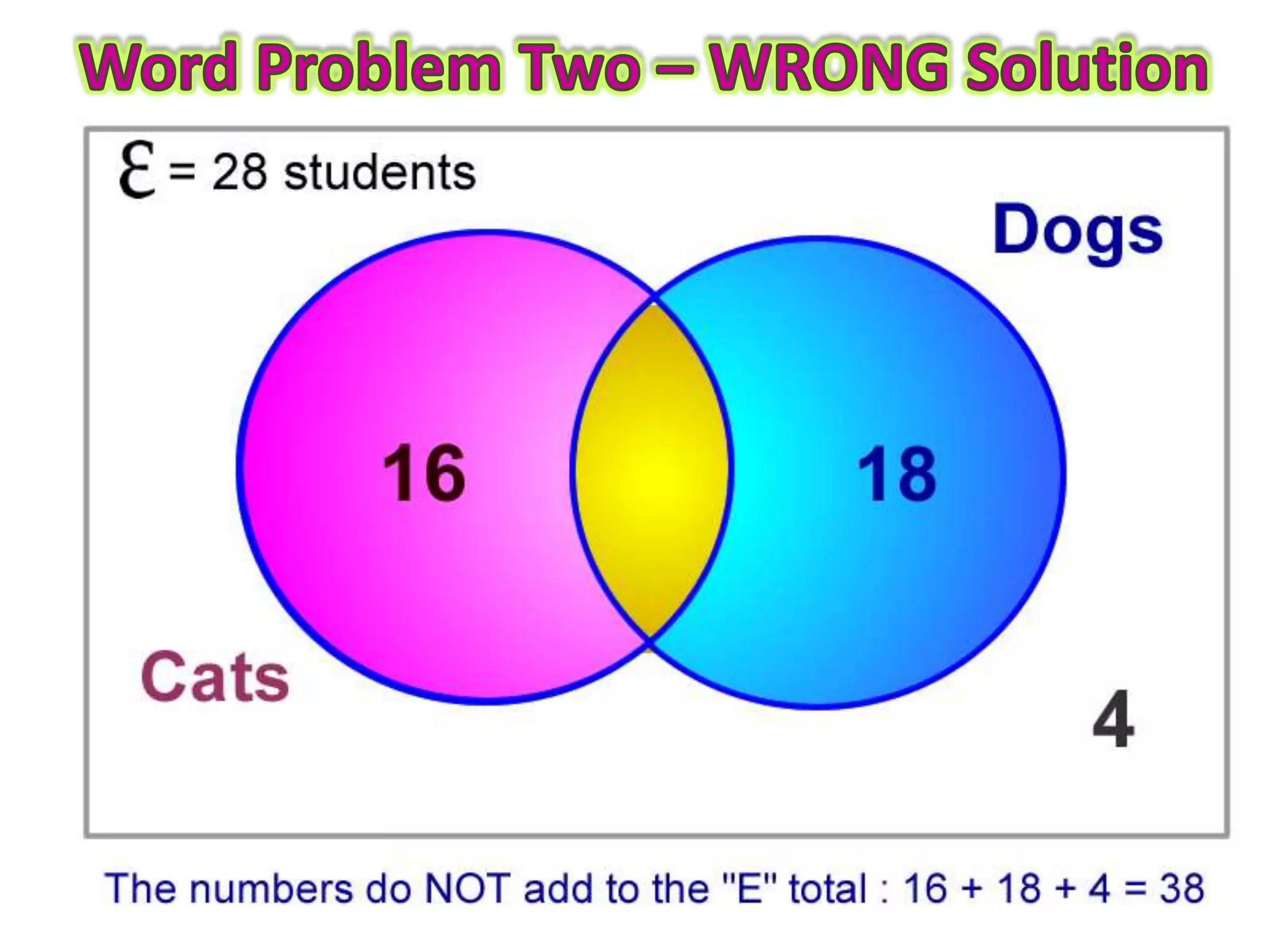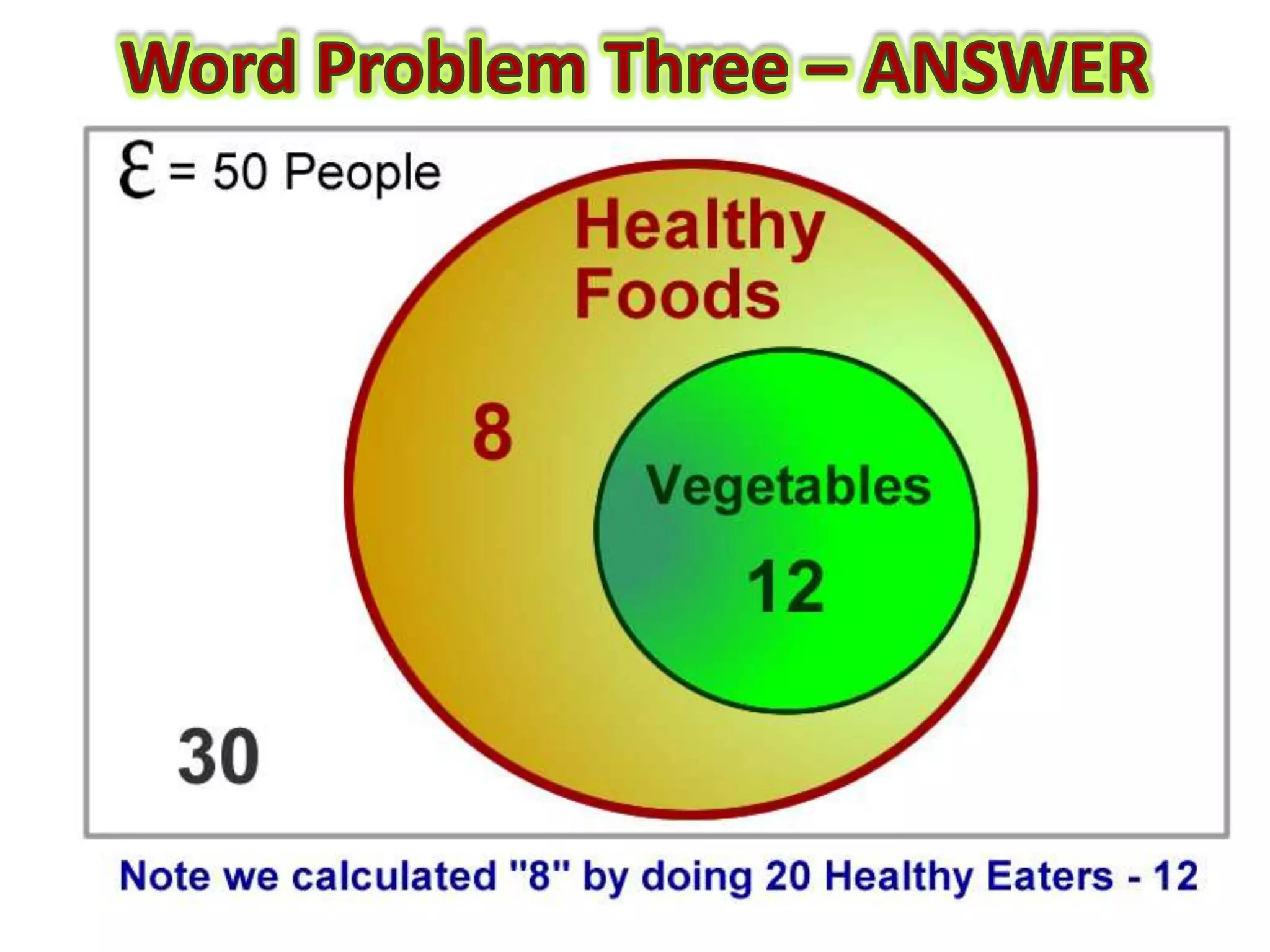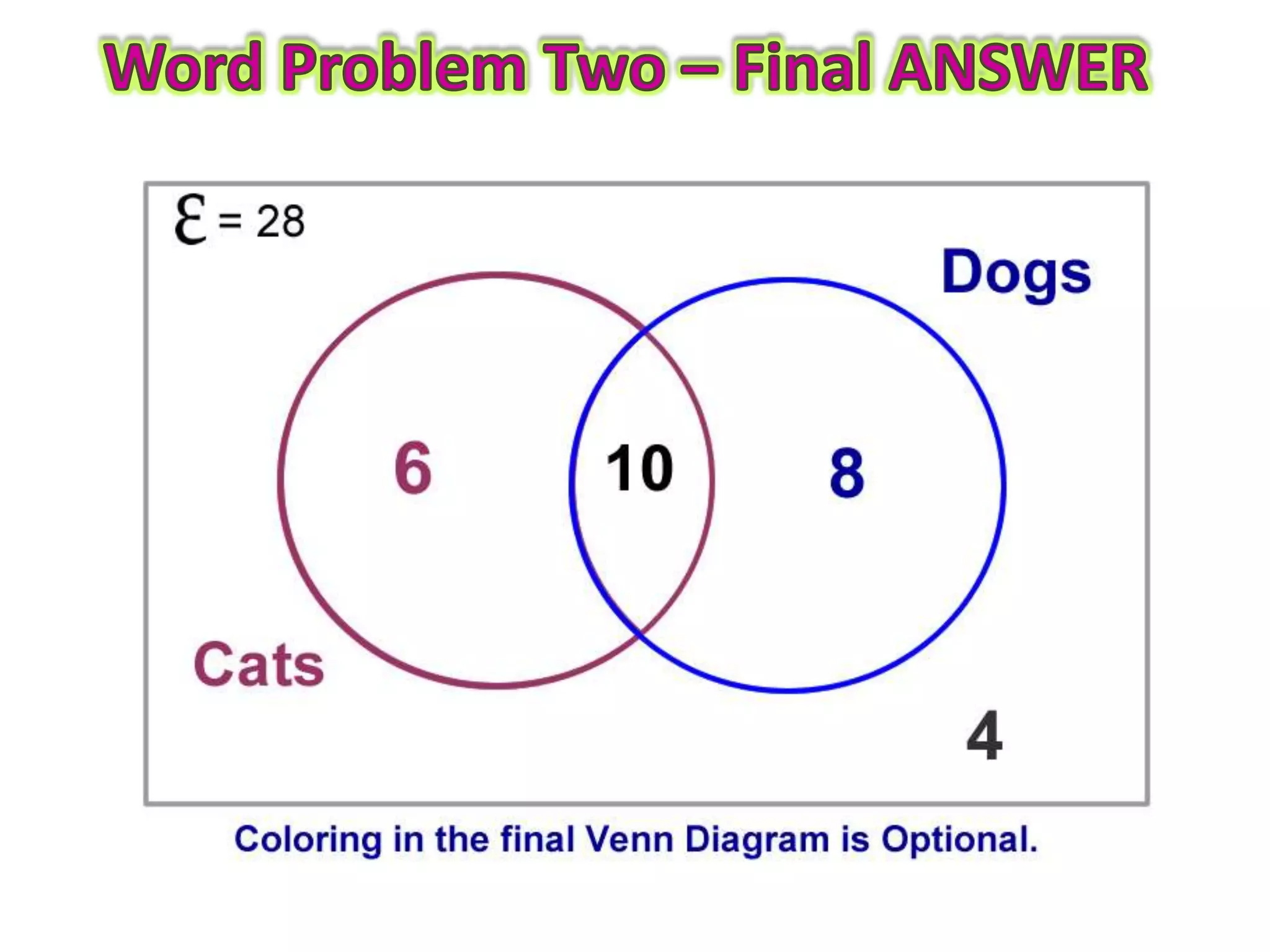 This document provides guidance on how to solve problems using Venn diagrams. It explains that Venn diagram problems require carefully reading the question, understanding the standard parts of a Venn diagram, and working step-by-step. It then walks through examples of 2-circle Venn diagram problems, demonstrating how to place the given information on the diagram and determine any missing values. The document emphasizes checking that all numbers add up correctly and discusses different types of relationships between sets, like intersecting, mutually exclusive, and subsets.