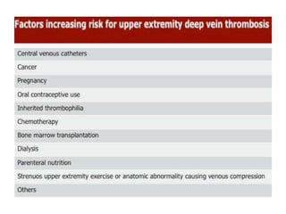 This document discusses the anatomy and ultrasound evaluation of veins in the upper extremity. It describes the cephalic, basilic, brachial, axillary, subclavian, and internal jugular veins. The technical procedure for venous doppler ultrasound is outlined, including patient positioning, scanning techniques, and diagnostic criteria. Potential pitfalls like rouleaux and limited windows are noted. Chronic changes after deep vein thrombosis like valve changes and collateral veins are also described. Ultrasound is useful for evaluating suspected deep vein thrombosis and mapping veins for dialysis access planning.