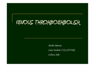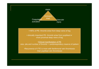 This document discusses venous thromboembolism (VTE), which includes deep vein thrombosis (DVT) and pulmonary embolism (PE). It covers Virchow's triad as the underlying causes of VTE, clinical presentation of PE, diagnostic tests including D-dimer and imaging, risk stratification for PE-related mortality, anticoagulation treatment including heparin and warfarin, and hemodynamic and respiratory support for high-risk PE patients. Key points include that >90% of PEs originate from the leg deep veins, recurrence is higher for iliac vein thrombosis, and diagnostic algorithms involve assessing clinical probability and using tests like CT, ultrasound, and D-dimer.