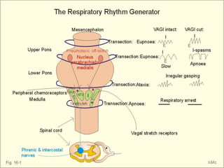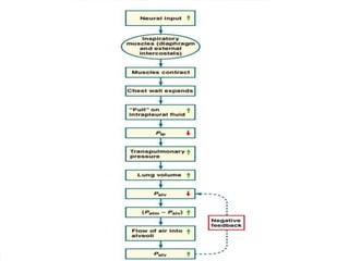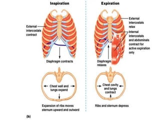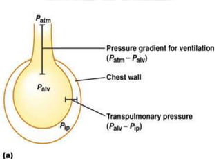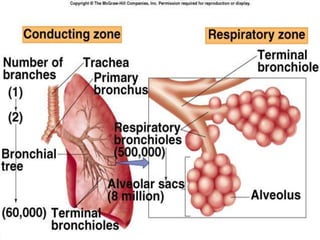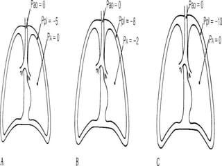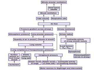 The document provides information on ventilation and the anatomy of the respiratory system. It defines ventilation as the mass movement of gas in and out of the lungs. It then describes the anatomy of the airways from the nostrils down to the alveoli. This includes details on structures like the nasal cavity, pharynx, larynx, trachea, bronchi, and terminal bronchioles. It also discusses factors that affect ventilation like pulmonary pressures, the mechanics of breathing, and control of breathing.