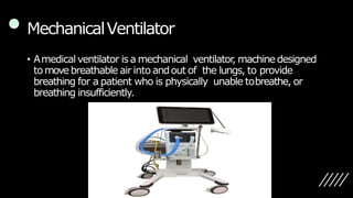 This document provides information on mechanical ventilator care. It discusses the purpose, equipment, types (invasive and non-invasive), modes, settings, and management of patients requiring mechanical ventilation. Key points include the goals of mechanical ventilation are to maintain effective ventilation and prevent complications. Modes of invasive ventilation discussed include volume control, pressure control, and pressure support. Settings that must be monitored and adjusted include tidal volume, respiratory rate, PEEP, FiO2 and more. The document also covers weaning a patient off the ventilator.