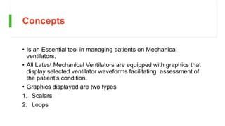 1) Ventilator graphics display waveforms that facilitate assessment of a patient's condition on mechanical ventilation. The most commonly used graphics are scalars (flow vs time, pressure vs time, volume vs time) and loops (pressure-volume, flow-volume).