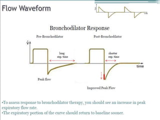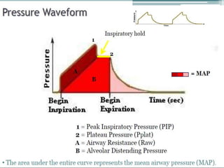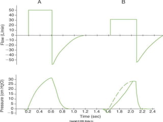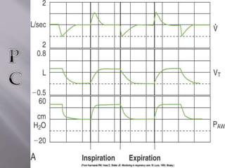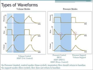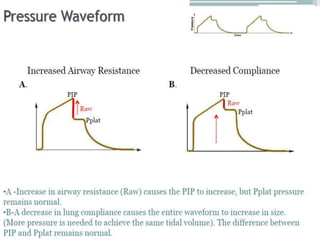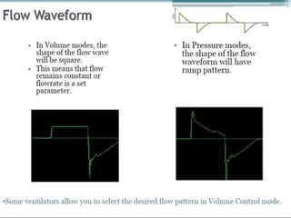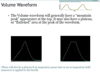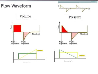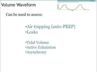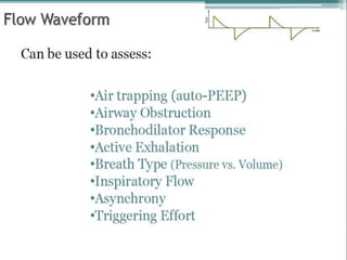Mechanical ventilation graphics provide important information to interpret patient response, disease status, and ventilator function. Scalars plot pressure, volume, or flow over time, while loops plot pressure versus volume or flow versus volume with no time component. Common waveforms include square, ramp, and sine waves. Pressure modes result in square pressure waves while volume modes produce ramp waves. Loops can indicate breath type and assess issues like air trapping, resistance, compliance, and asynchrony. Graphical analysis is a critical tool for ventilator management and optimization.