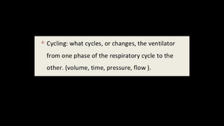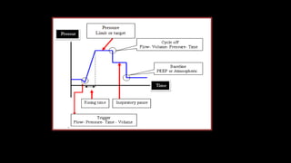 The document provides comprehensive information on ventilator mechanics, including definitions of ventilation and respiration, compliance and resistance in the respiratory system, and types of mechanical ventilators. It explains different types of ventilator waveforms, their significance, and the impact of airway resistance and compliance on pressure-time relationships. Various flow patterns and their effects on breathing dynamics are also discussed, along with key equations and diagrams illustrating the respiratory system's mechanics.