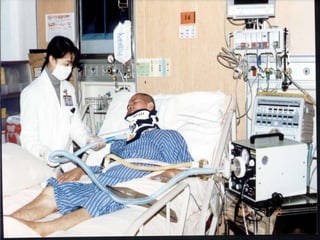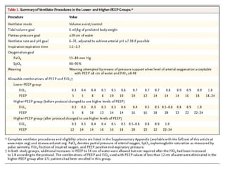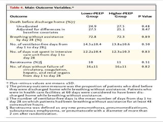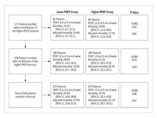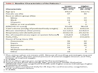 The document discusses ventilator management in different disease entities. It covers indications for mechanical ventilation in conditions like respiratory failure, ARDS, COPD, chest trauma, and head injury. For ARDS specifically, it summarizes the key findings of the NIH ARDS Network trial which demonstrated that a lower tidal volume strategy of 6 ml/kg predicted body weight reduced mortality compared to the traditional higher tidal volume approach.