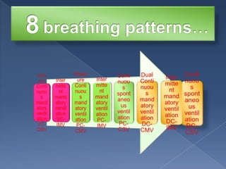 1. A ventilator mode describes how the ventilator controls pressure (P), volume (V), and flow within each breath through a primary control variable (V, P, or dual) and how mandatory and spontaneous breaths are sequenced (CMV, IMV, CSV).