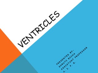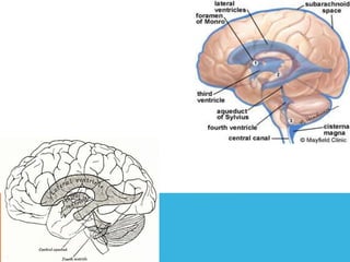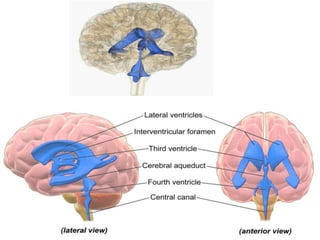 The brain contains four interconnected fluid-filled cavities called ventricles that produce and circulate cerebrospinal fluid (CSF). The ventricles include the left and right lateral ventricles, the third ventricle, and the fourth ventricle. CSF is produced by choroid plexus tissue within the ventricles and flows between the ventricles through connecting openings before circulating around the brain and spinal cord to provide cushioning. Blockages within the ventricles or connections between them can cause excess fluid buildup and issues like hydrocephalus.