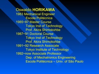 Oswaldo Horikawa is a mechanical engineer and associate professor at the Escola Politécnica of the University of São Paulo, specializing in mechatronics. His significant research includes the development of an implantable ventricular assist device using magnetic bearing technology. He is also involved in various ongoing projects such as a non-conductive manipulator, robotics for electric power distribution maintenance, and hospital pharmacy automation.